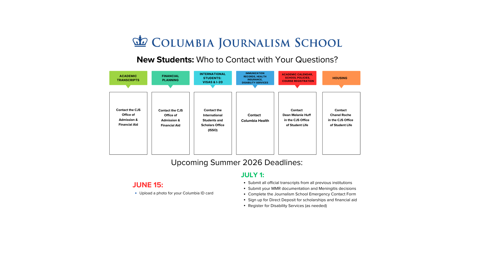 New Student Guide 2026-27: Frequently Asked Questions & ContactsPlease click on the image above for a larger visualization.FREQUENTLY ASKED NEW STUDENT QUESTIONS:ENROLLMENTQ: How and by when do I need to make my enrollment decision?A: Please consult your specific letter of admission to find your enrollment deadline date. The Enrollment Response Form can be found on your Applicant Status page in the online application system or in your admissions letter. The enrollment fee can be paid with a credit card by the deadline indicated in your admission letter. The Journalism School does not accept wire transfers. Students who fail to remit the enrollment fee by the deadline forfeit their place in the entering class. The enrollment fee is not refundable.ACADEMIC TRANSCRIPTSQ: I already submitted a transcript with the admissions application - do I need to resend one?A: You will need to submit official academic transcripts of your previous academic work to CJS. An official transcript is one that comes directly from the university or through a credentials verification service. If you uploaded or emailed us the transcript yourself, it is not official. If you already had your university send us the final official transcript showing the conferral of your degree, you will not need to have a new one sent to us. If you had an official transcript sent to us before the completion of your degree, you will need to have a new official transcript sent that shows that you have received your degree.Q: I had my official transcript from my bachelor's degree sent in. Do I need to send transcripts from other universities that I attended? A: You must have official transcripts from every university you have attended (including undergraduate schools, community colleges, graduate schools, non-degree programs, and study abroad programs), without exception, sent to CJS by no later than July 1.Q: What options do I have for sending my transcripts to the CJS admissions office?A: We require electronic transcripts, but will accept others when electronic transcripts are not an option. There are different transcript submission guidelines for U.S-based and international institutions. Please click HERE for detailed instructions, including information about transcript evaluation by the World Education Services (WES).Q: I sent my transcripts to Columbia University, so why are my transcripts not shown as being received? A: Official transcripts must be sent directly to the Office of Admission and Financial Aid at Columbia Journalism School, with the recipient email address as apply.journalism@columbia.edu. We do not have access to retrieve transcripts sent electronically or through the mail to other schools within Columbia University (such as the Columbia University Graduate School of Arts and Sciences). You will need to resend transcripts directly to Columbia University Graduate School of Journalism. Q: If my transcripts are not in English, do I need to send a translation? A: If the institution you attended does not provide an English translation with the official transcript, a certified verbatim English translation of the transcript and diploma must be sent directly from the translation service to CJS. Columbia has no preferred translating services. However, many of our applicants use World Education Services to assist in English translation and verification. Please note: WES charges a fee for this service.Q: The final semester of my current academic program ends in the summer (after July 1st). What happens if my official transcripts arrive late? A: Please contact the admissions office for guidance at apply.journalism@columbia.edu.Q: How can I confirm that my official transcripts have been received?A: Students will be notified directly over the summer if they are missing official transcripts.FINANCIAL PLANNINGQ: When are bills due? A: Please review the billing schedule HERE. 2026-27 dates should be posted soon.Q: Are any more institutional scholarships available? A: All available institutional aid has already been awarded. No changes to institutional scholarships will take place at this time.Q: Can I still request a loan? A: Yes, you may request a loan or a change to your loan for the 2026-27 academic year up until the first week of May 2027.Q: Where can I find more educational financing information?A: Please review the 2026-27 Financial Aid Key HERE.Q: When can I expect to receive my refund?A: If your aid exceeds your University charges, then you will receive a refund 7-10 business days after your aid is credited to your account. Refunds are disbursed in August, but the exact date will vary by program.Q: Can I schedule an educational financing appointment this summer? A: Yes, please email us at apply.journalism@columbia.edu.INTERNATIONAL STUDENTS: I-20 & VISASQ: Who should I contact about visa and international student questions? A: The Columbia University International Students and Scholars Office (ISSO) works directly with students needing documentation to enter the U.S. They also provide guidance and resources for obtaining a visa, I-20 form and opening a U.S. bank account. All queries should be directed to ISSO.REQUIRED IMMUNIZATION DOCUMENTATIONQ: Who should I contact with questions about required immunization documentation? A: You must complete the Columbia University Measles, Mumps and Rubella form and submit it to the Columbia Health Immunization Compliance Office no later than July 1. Please consult the New Student Checklist for more details. All immunization queries should be directed to the Columbia Health Immunization Compliance Office. If you have questions, please email immunizationcompliance@columbia.edu.HEALTH INSURANCEQ: Who should I contact with health insurance questions?A: Columbia University requires all registered full-time students to have health insurance. International students are required to enroll in the Columbia University Student Health Insurance Plan. Please consult the New Student Checklist for more 